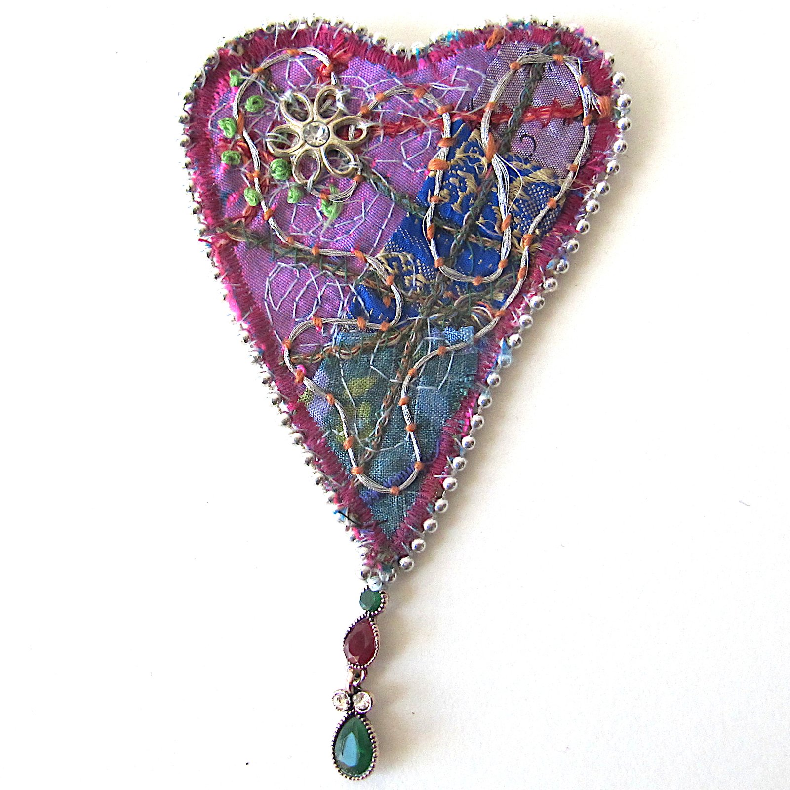Delicate hand embroidered stitches, embellished with silver thread. A flower motif and a beaded dropper