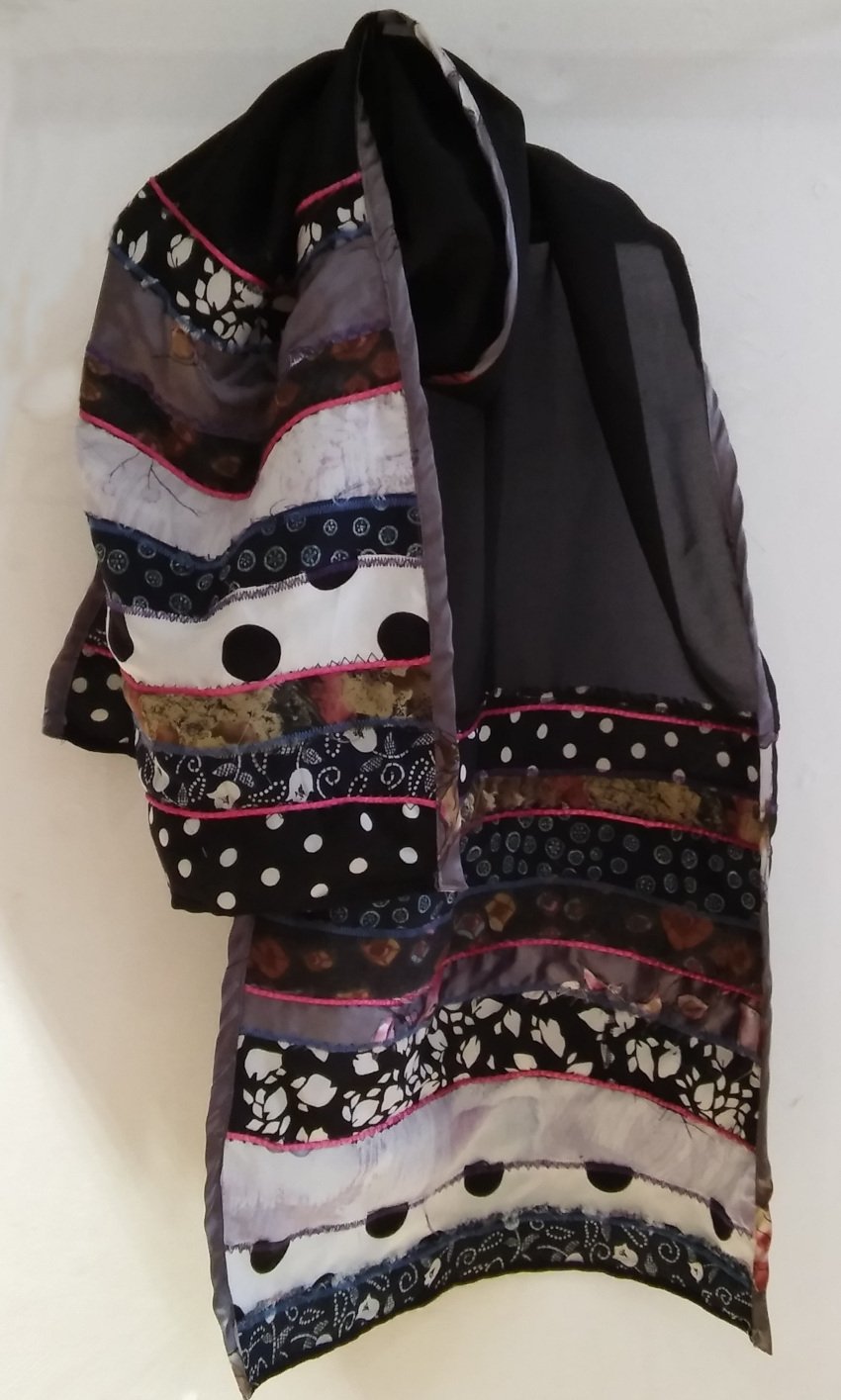 The sheer, dark base provides a flowing, ethereal backdrop that lets each appliqué stand out with bold contrast. From silky jewel-toned patches to textured cottons and shimmering satins, each piece brings a unique burst of color and character, creating a mosaic-like effect.
