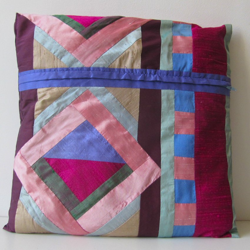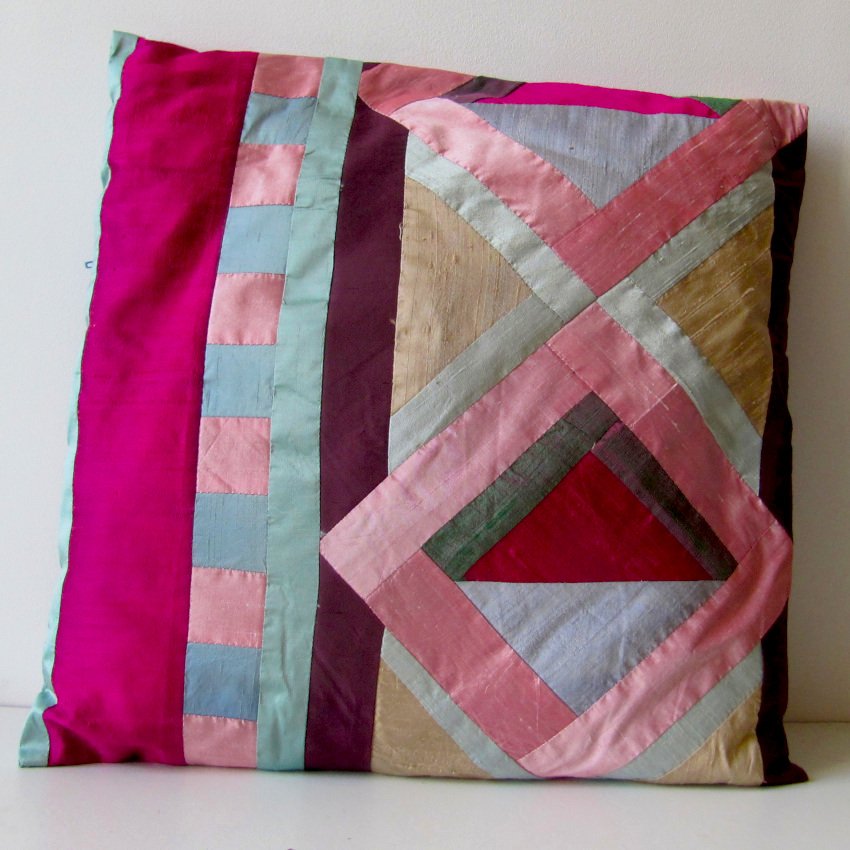 A delicate yet vibrant creation crafted from geometric silk patchwork in a soft palette of pastel hues adding a sense of structure and sophistication.