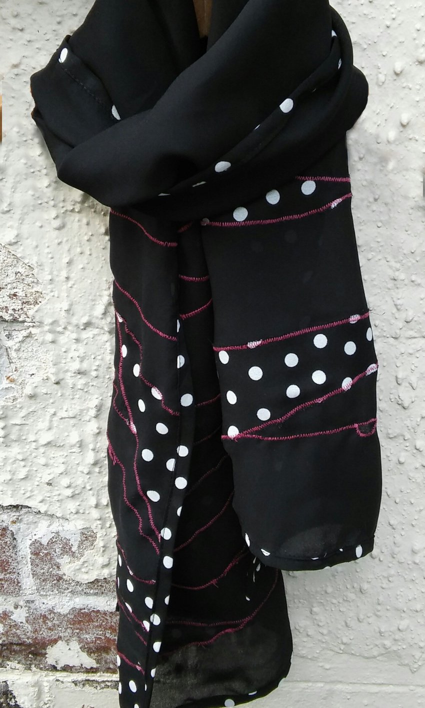 The black georgette base gives the scarf a soft, flowing drape, while the contrasting appliqué strips add texture and visual interest. The polka dots bring a touch of retro charm, while the, detailed machine embroidery and cutouts introduce an artisanal feel combining sophistication with a hint of playful elegance, making it a versatile accessory that can effortlessly elevate both casual and formal outfits.