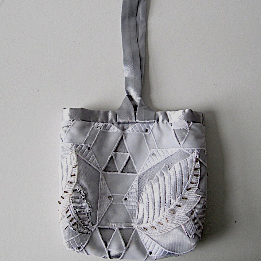 Mini bag in silver grey satin overlaid with a cut-out design, embellished with beads and finished with a wrist strap and loop.